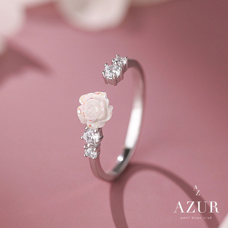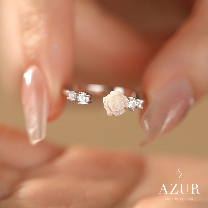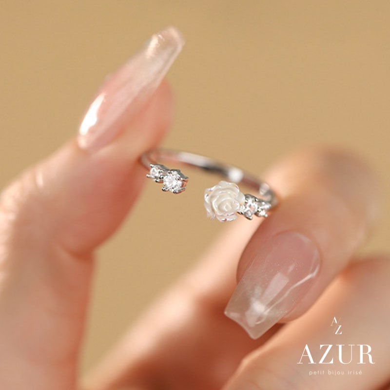 可憐なホワイトローズが咲く、繊細で上品なジルコニアホワイトローズリング。