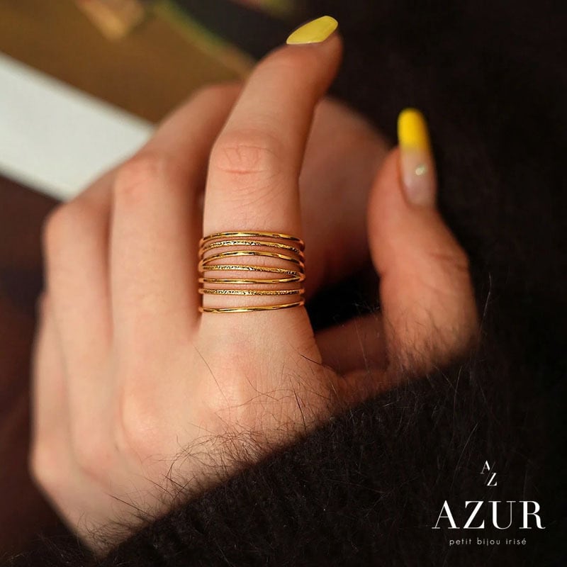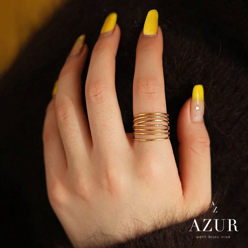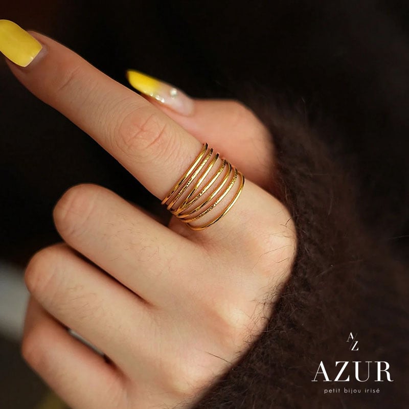 細いゴールドラインを何層にも重ねたようなシルエットは、まるで光をまとっているかのような美しい存在感を放ちます。