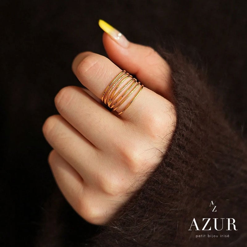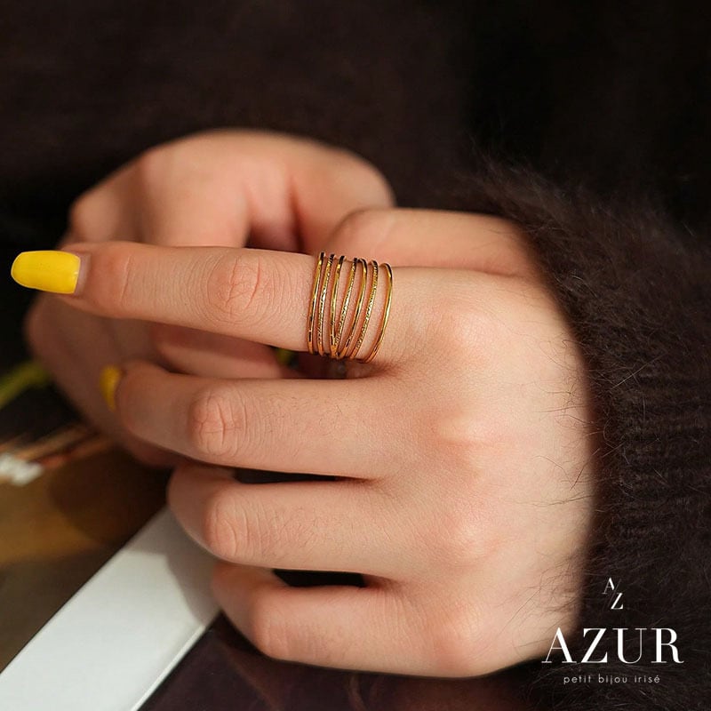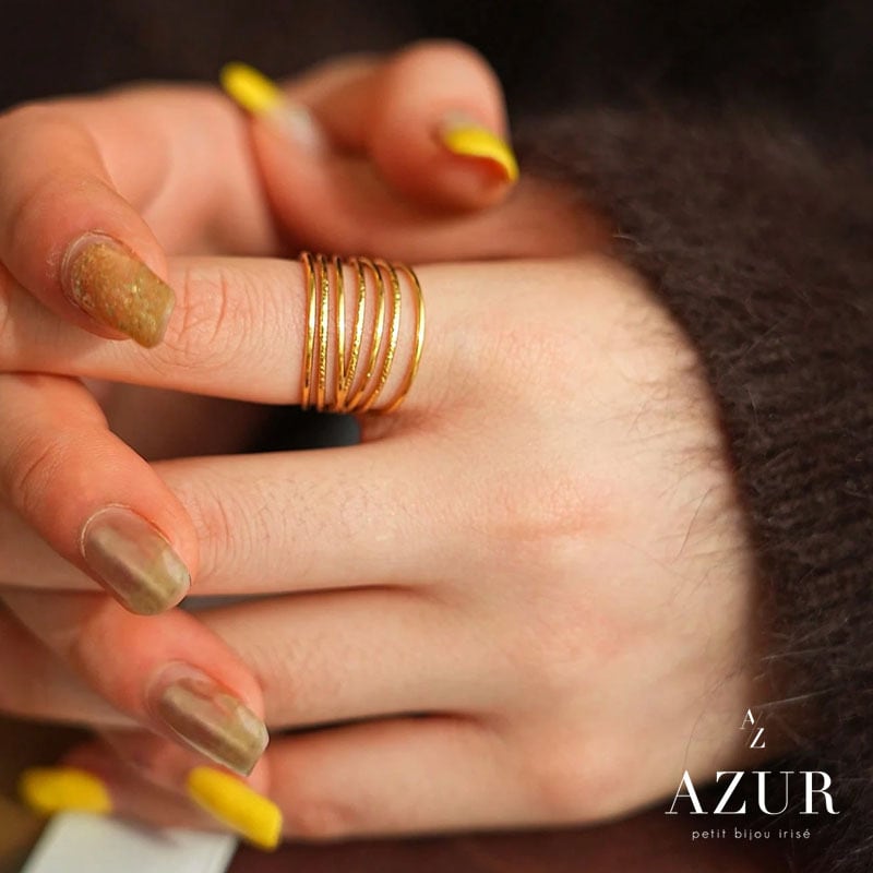 繊細なラインが重なり合うようにデザインされた、大人の抜け感を纏うシースルーゴールドリング。